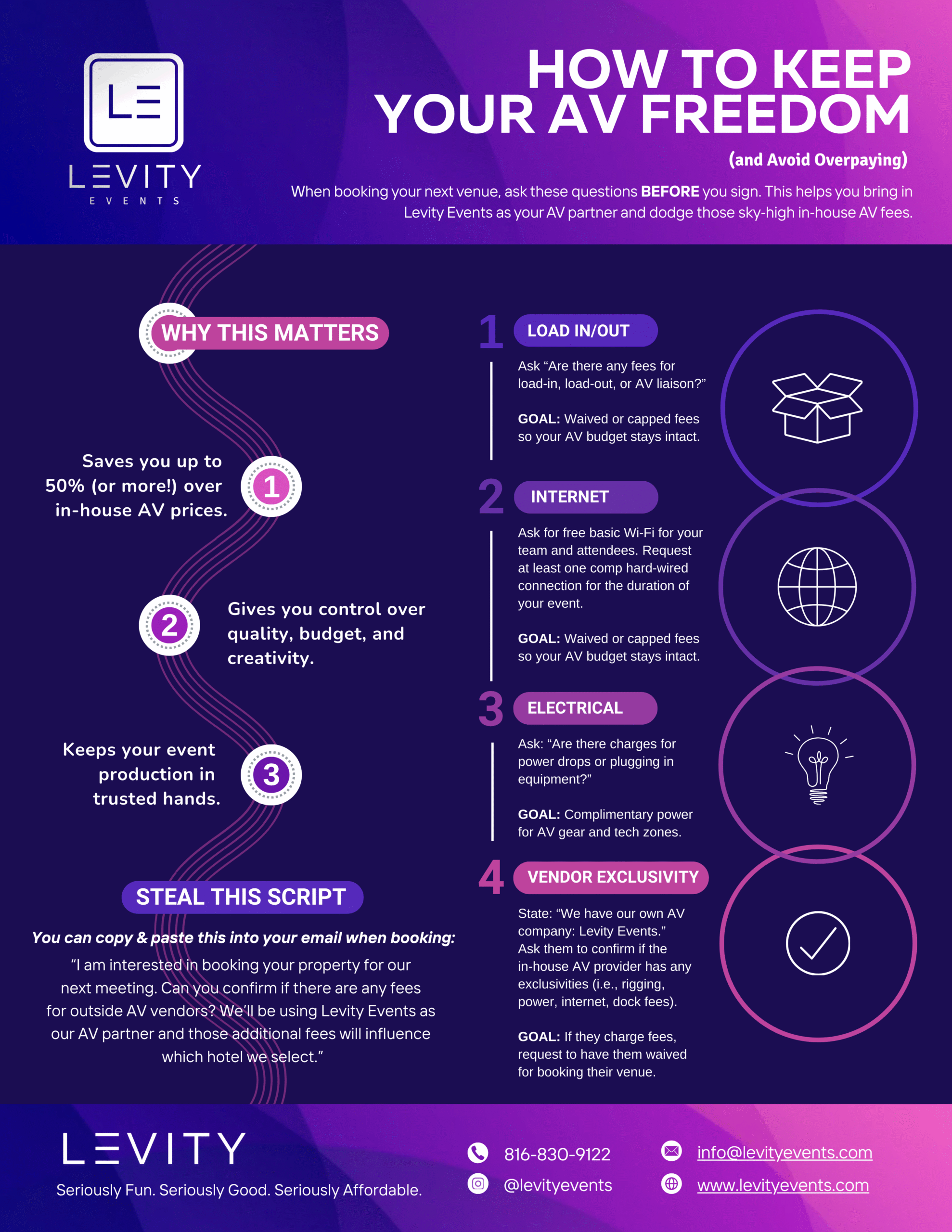 We love a good hotel ballroom, but not the surprise AV fees that can come with it. Our AV Freedom Guide gives you the insider questions to ask before you sign that venue contract, so you can bring in your own AV dream team (aka: us) without paying a premium. Print it, save it, or forward it to your planner friends. It’s seriously useful.